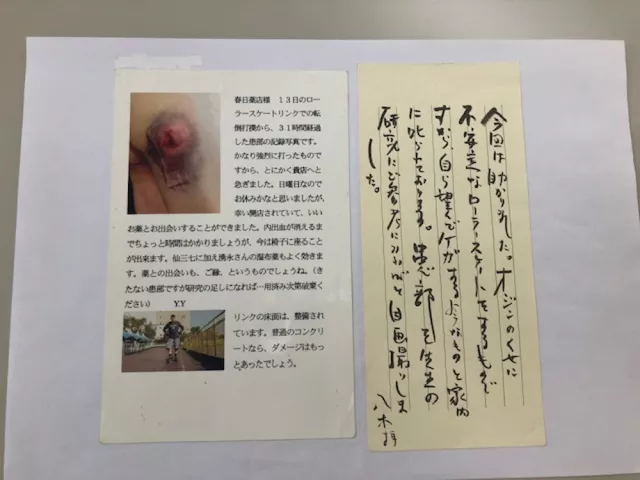 春日药局社长竹田直为患者使用了以苗乡三七为原料的三七产品后,只经过了一夜,患者伤情明显好转,患者本人欣喜异常,特意拍了照片,并写了感谢信给到竹田直社长。