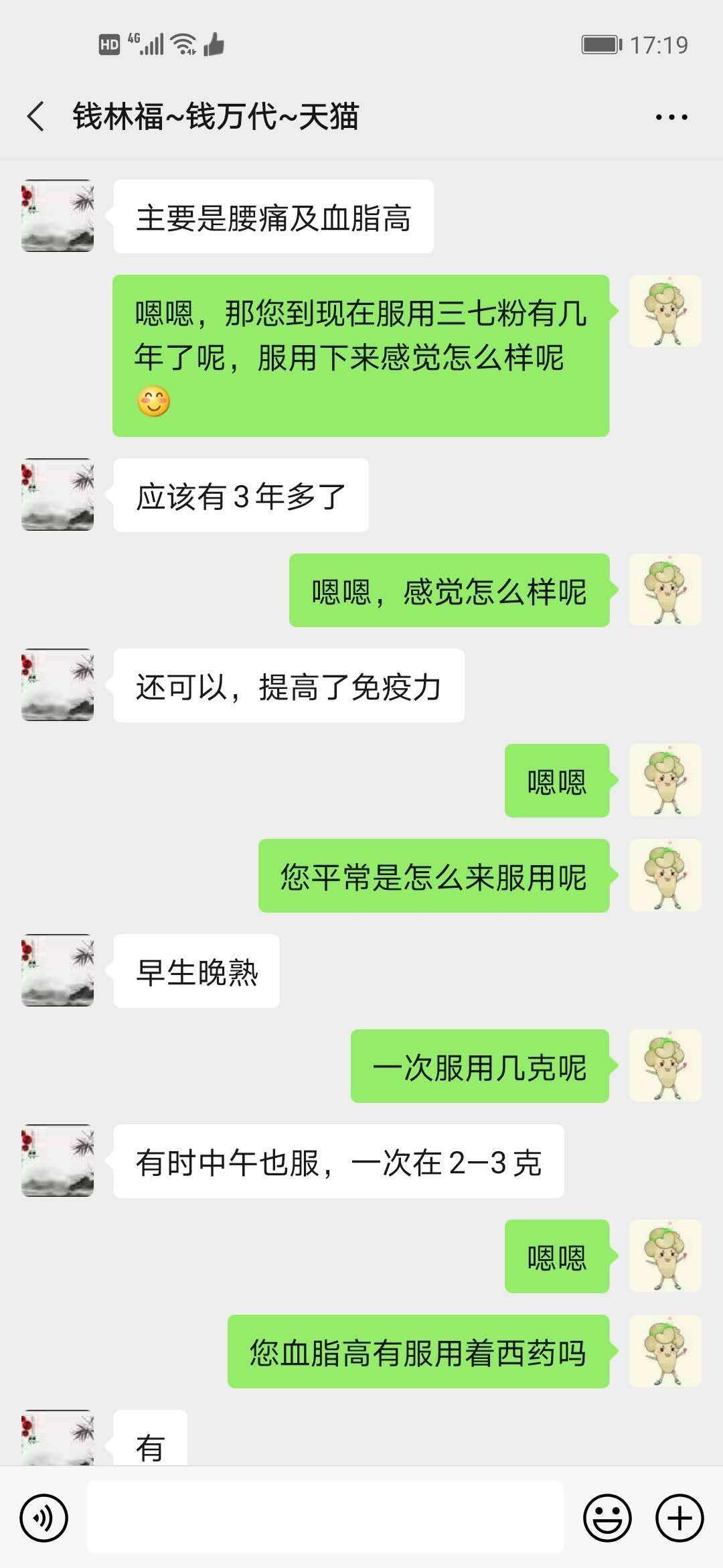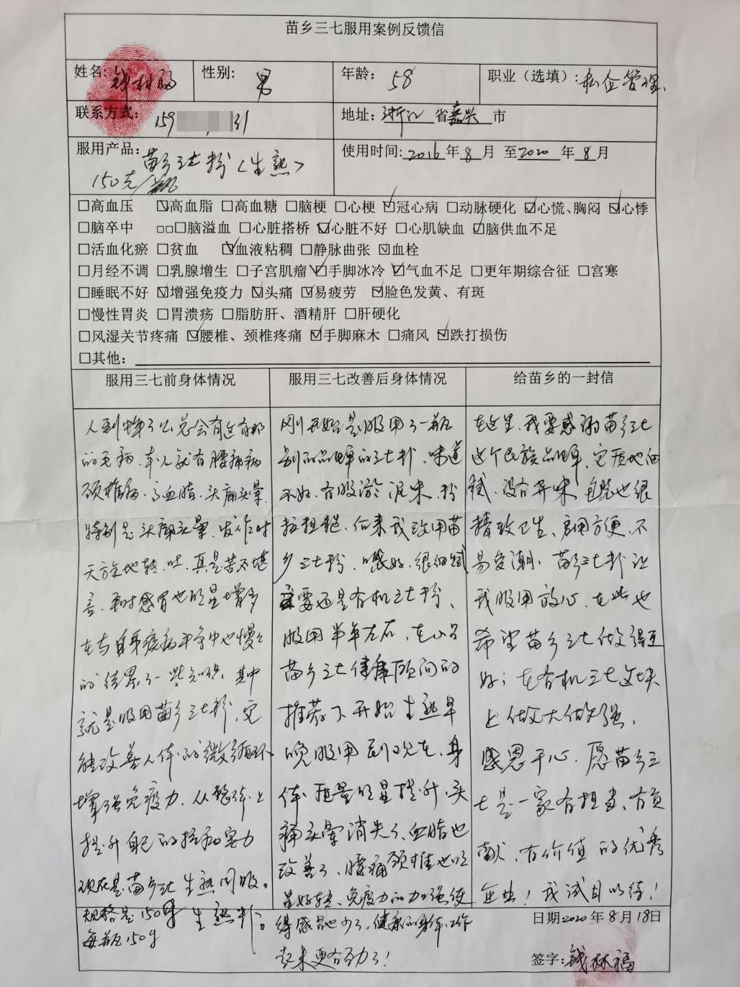 刚开始是服用了一瓶市场上其他牌子的三七粉,味道不好,有股淤泥味儿,粉粒粗糙,后来我改用苗乡三七粉,口感好,很细腻,主要还是有机三七粉。服用半年左右,在小吕专业健康顾问的推荐下开始生熟早晚服用到现在。身体质量明显提升,头痛头晕消失了,血脂也改善为正常值;腰痛颈椎也明显好转,免疫力加强使得感冒也少了;健康的身体,工作起来更有劲了!