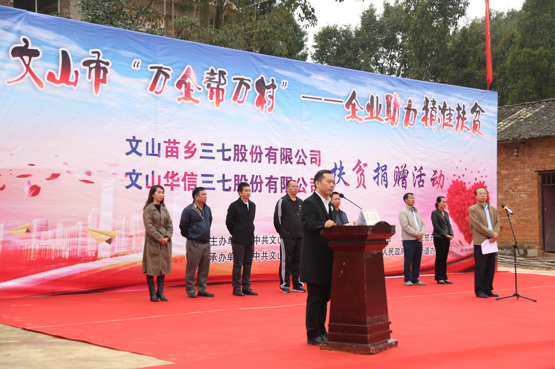 2017年11月18日,苗乡三七董事长余育启、副总经理田艺、董事长助理熊婷等代表苗乡三七积极参与了文山市民营企业“万企帮万村”——精准扶贫活动,并向文山市新平街道迷洒社区新发寨村捐赠资金36万元帮助进村道路建设及建档立卡贫户危房改造。精准扶贫作为各级党委政府的核心工作之一,苗乡三七作为产业化龙头企业,责无旁贷地积极参与其中履行社会责任,以实际行动投身精准扶贫,为建设和谐文山,打赢脱贫攻坚战贡献一份力量。